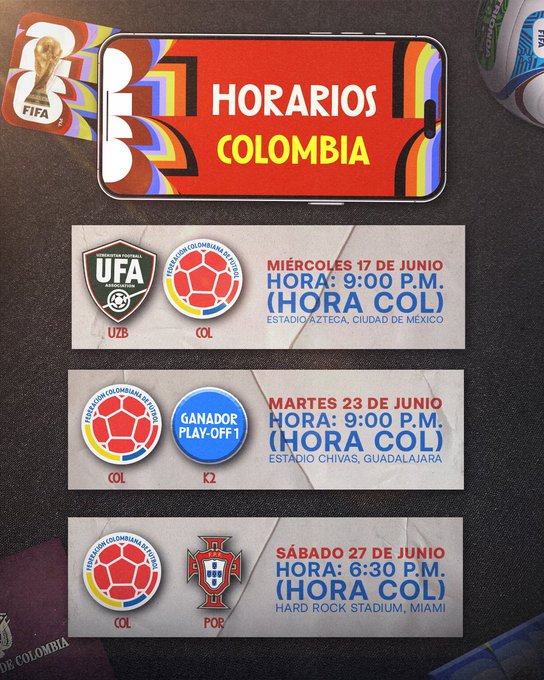 Los dos primeros partidos de Colombia, contra Uzbekistán y Congo, Jamaica o Nueva Caledonia, serán a las 9:00 p.m., hora de nuestro país. El duelo contra Portugal será a las 6:30 p.m.