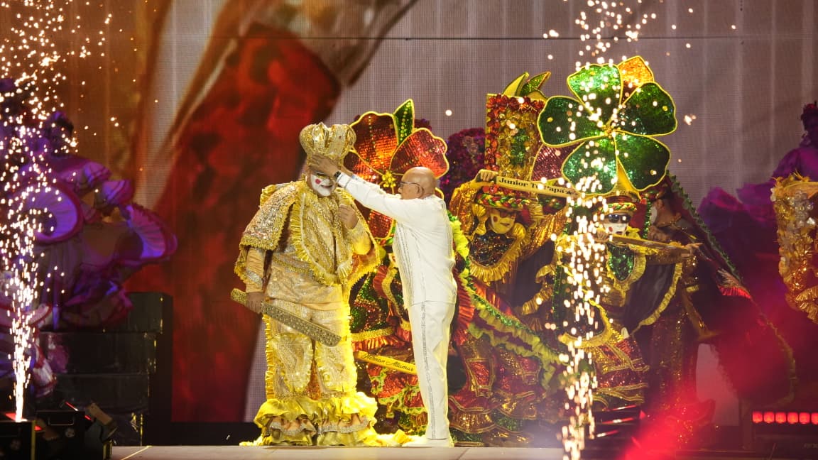El Rey Momo deslumbró con un vestido de Congo dorado, es una propuesta que exalta la responsabilidad de custodiar la tradición, la memoria popular y la esencia viva del Carnaval.